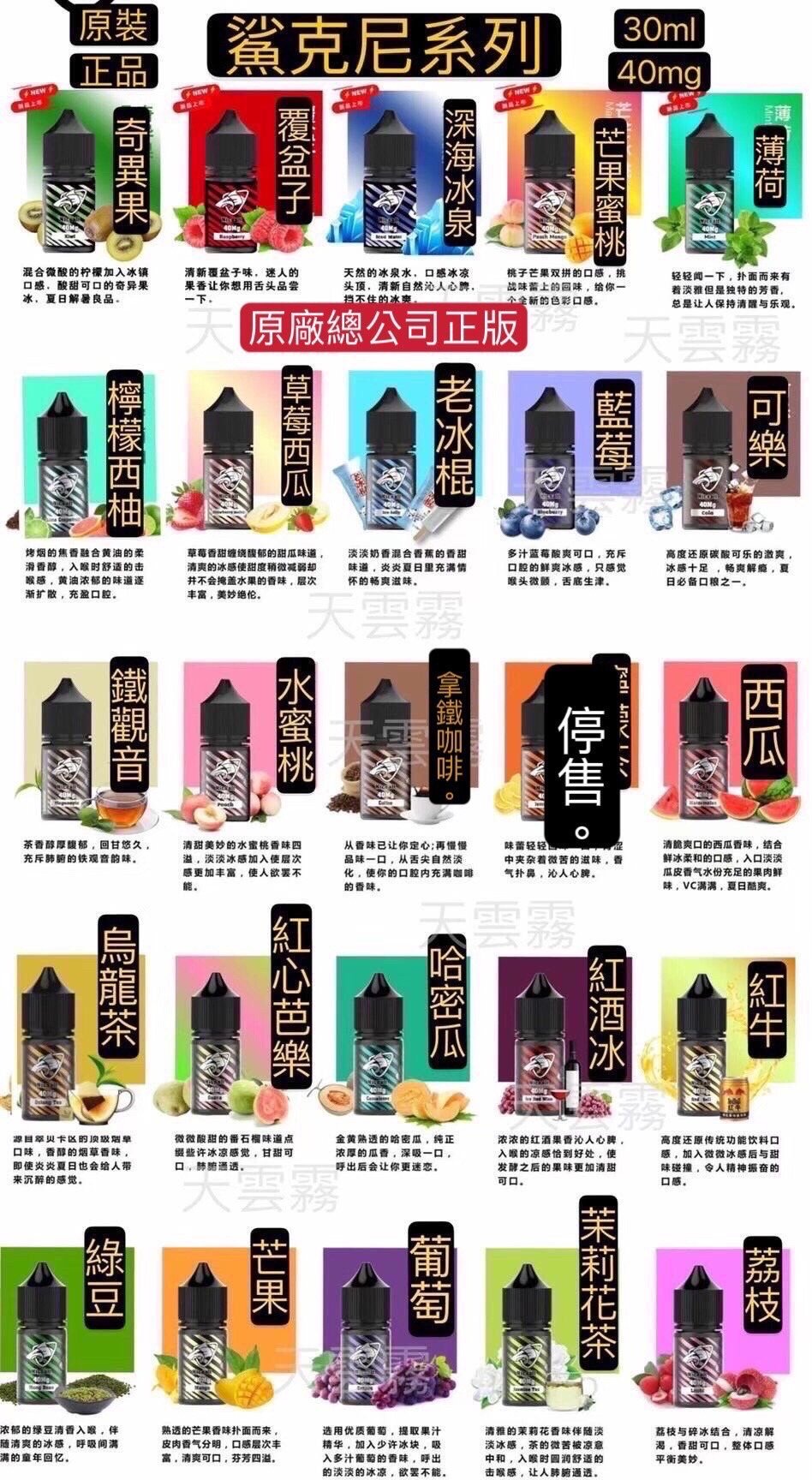 | 口味 | 哈密瓜, 奇異果, 寶礦力, 拿鐵咖啡, 橘子莓冰, 檸檬茶, 檸檬西柚, 櫻桃蘇打, 水蜜桃, 深海冰泉, 烏龍茶, 白葡萄汁, 紅冰西柚, 紅心芭樂, 紅牛, 紅酒冰, 翠貝卡菸草, 茉莉花茶, 草莓甜瓜, 蜜桃芒果, 西瓜, 覆盆子, 鐵觀音, 雙蘋果, 可樂, 綠豆, 老冰棍, 芒果, 荔枝, 葡萄, 薄荷, 藍莓 |