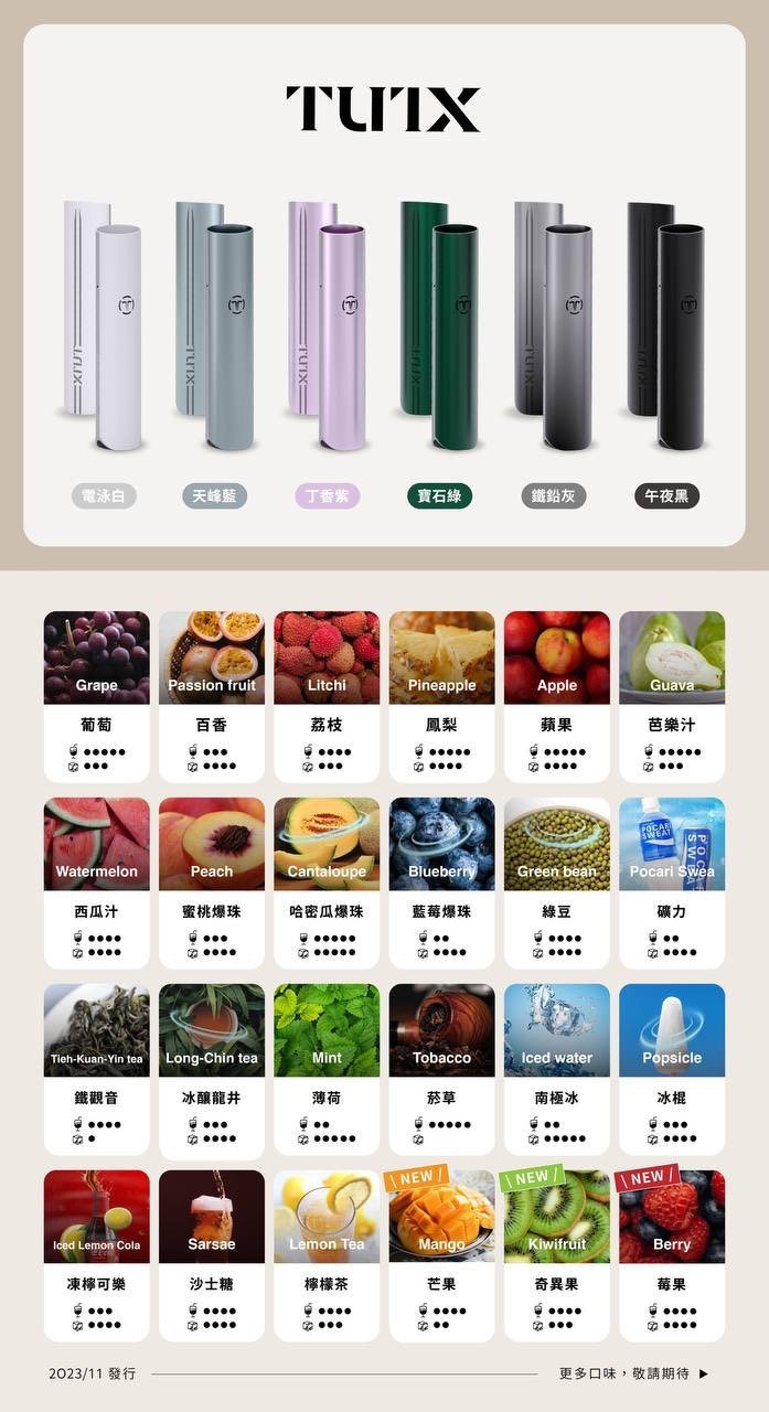 | 口味 | 冰梨, 南極, 可樂, 奇異果, 寶礦力, 檸檬茶, 沙士, 百香果, 綠豆, 老冰棍, 芒果, 芭樂, 荔枝, 莓果, 菸草, 葡萄, 蔓越莓, 薄荷, 藍莓爆珠, 蘋果, 蜜桃爆珠, 蜜瓜爆珠, 西瓜, 鐵觀音, 鳳梨, 龍井 |